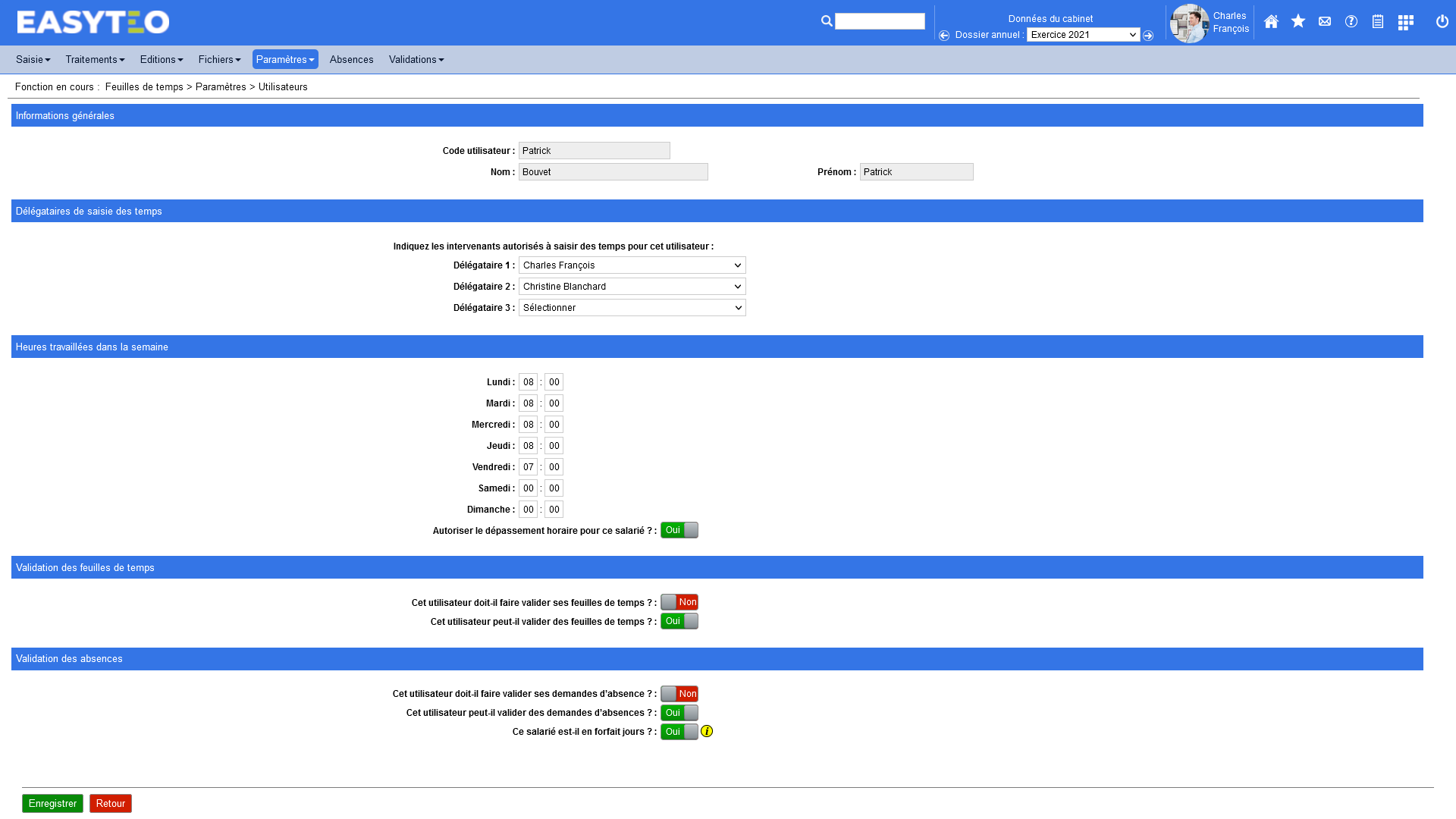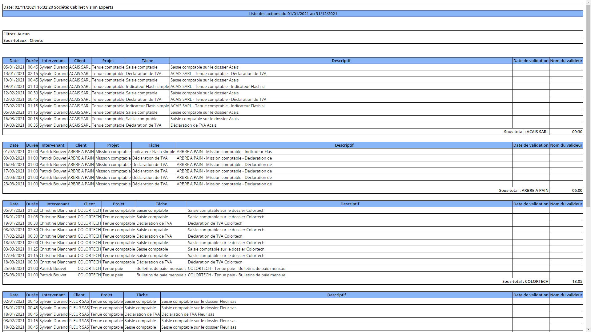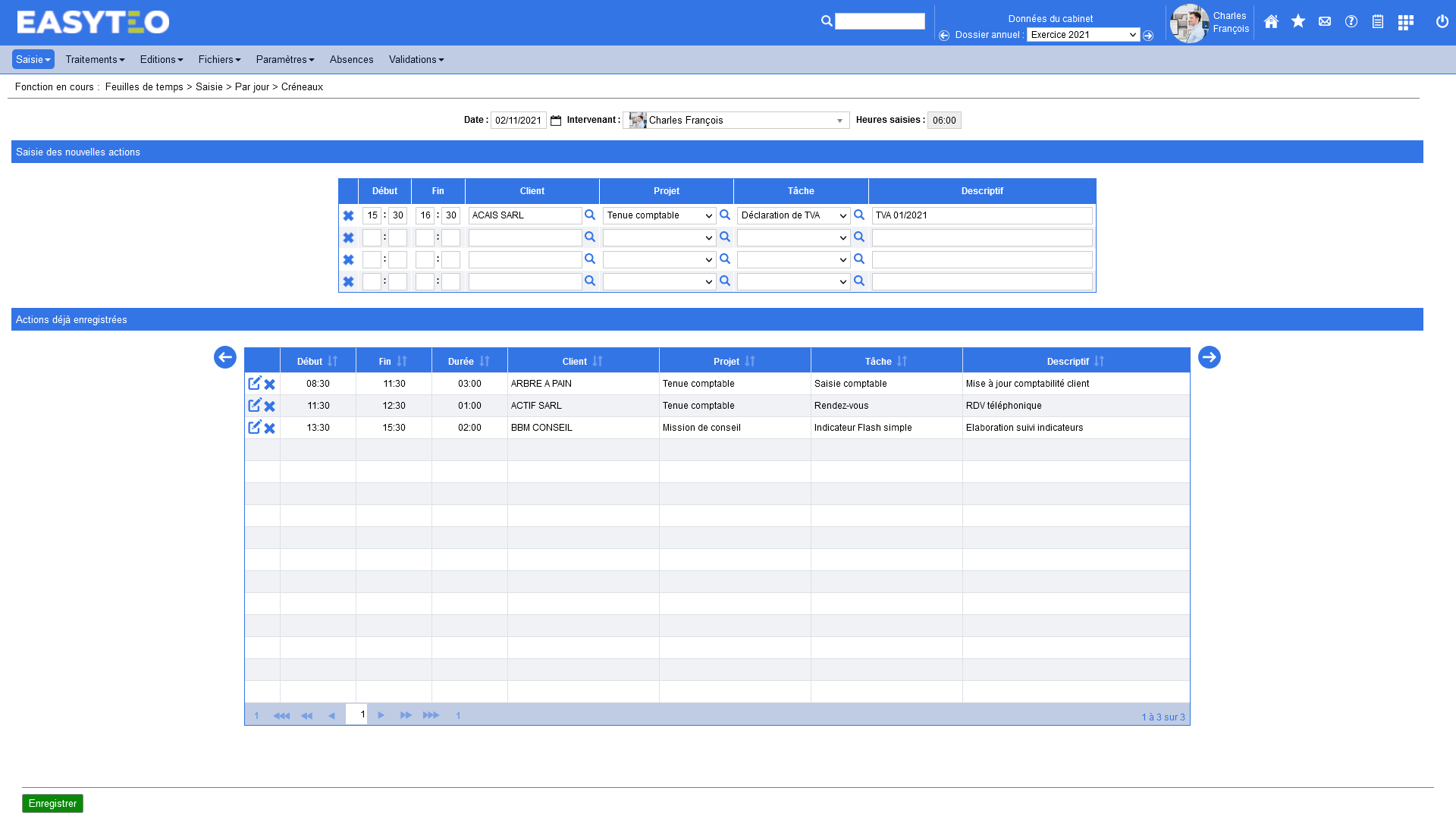 - Saisie par durée ou par créneau horaire Affectation des temps par dossier, client et tâche Délégation de saisie Analyse multicritère des temps saisis par jour, mois et année Demandes d’absences avec workflow de validation Projets génériques créés automatiquement pour chaque nouveau client