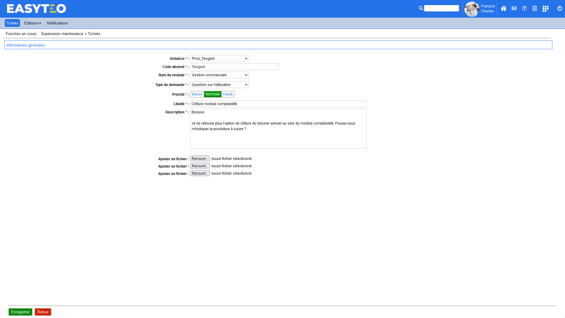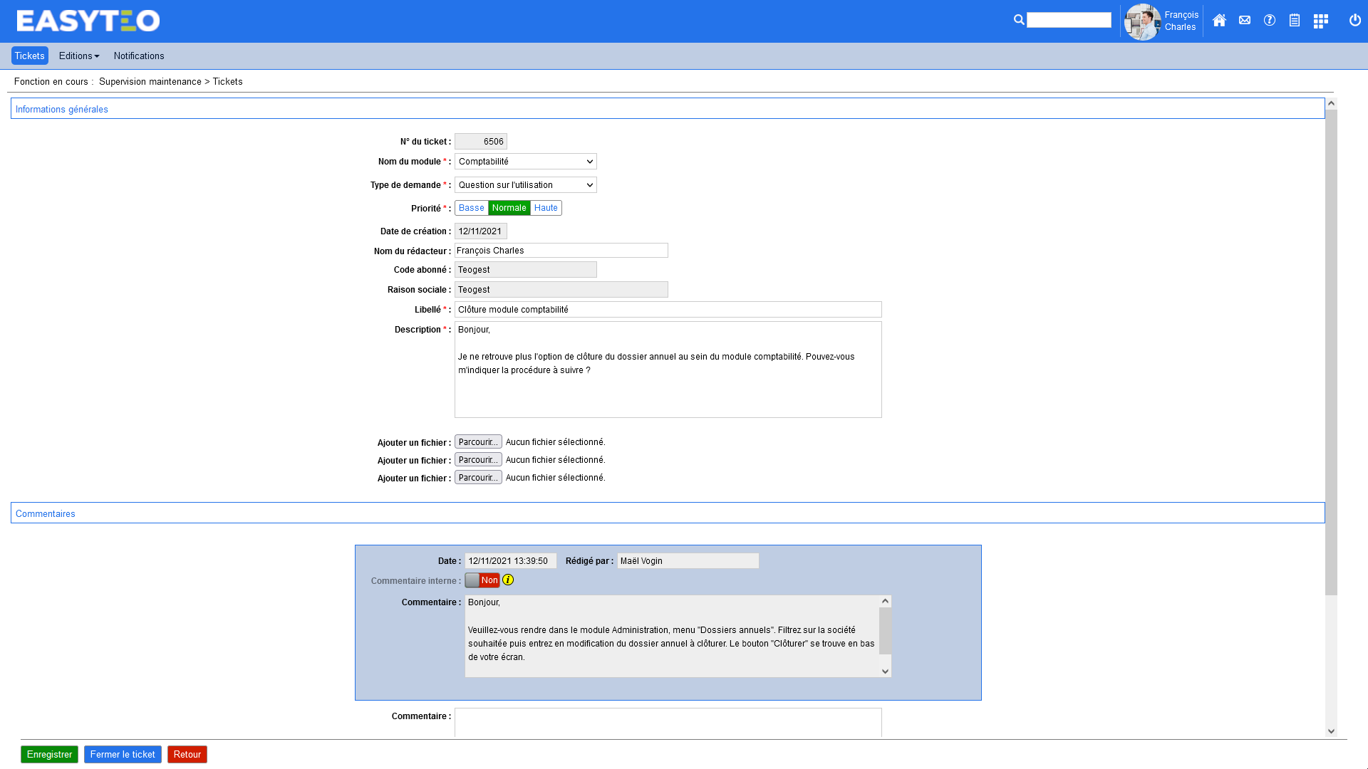 Chaque question est référencée par un numéro de ticket qui restera ouvert tant que le problème ne sera pas résolu et sera fermé par Easyteo ou l’utilisateur client dès que la réponse aura été apportée ou le problème réglé.
